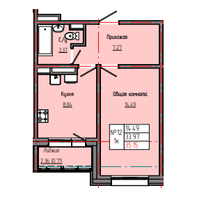 1-комн. 35,33 м² ・ № 12 ・ этаж 3/4 ・ ЗВЕЗДНЫЙ С3Б