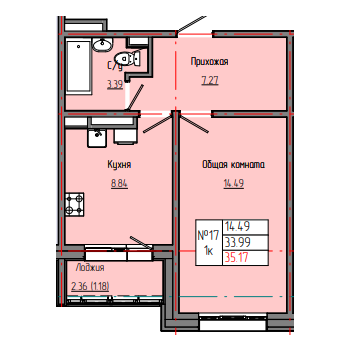 1-комн. 35,33 м² ・ № 17 ・ этаж 4/4 ・ ЗВЕЗДНЫЙ С3Б