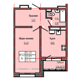 1-комн. 35,32 м² ・ № 22 ・ этаж 2/4 ・ ЗВЕЗДНЫЙ С3Б
