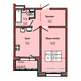 1-комн. 35,90 м² ・ № 23 ・ этаж 2/4 ・ ЗВЕЗДНЫЙ С3Б