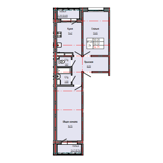 2-комн. 54,79 м² ・ № 28 ・ этаж 3/4 ・ ЗВЕЗДНЫЙ С3Б