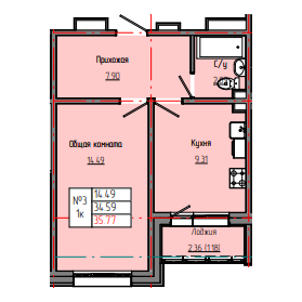1-комн. 35,90 м² ・ № 3 ・ этаж 1/4 ・ ЗВЕЗДНЫЙ С3Б