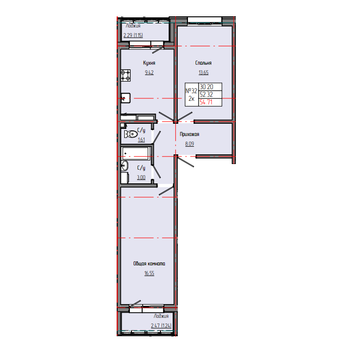 2-комн. 54,79 м² ・ № 32 ・ этаж 4/4 ・ ЗВЕЗДНЫЙ С3Б