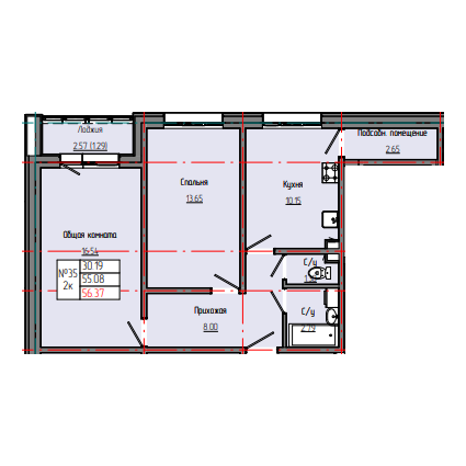 2-комн. 53,94 м² ・ № 35 ・ этаж 1/4 ・ ЗВЕЗДНЫЙ С3Б