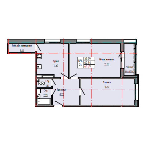 2-комн. 62,04 м² ・ № 4 ・ этаж 2/4 ・ ЗВЕЗДНЫЙ С3Б
