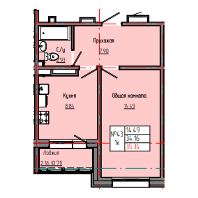 1-комн. 35,32 м² ・ № 43 ・ этаж 3/4 ・ ЗВЕЗДНЫЙ С3Б