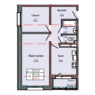 2-комн. 46,61 м² ・ № 44 ・ этаж 3/4 ・ ЗВЕЗДНЫЙ С3Б