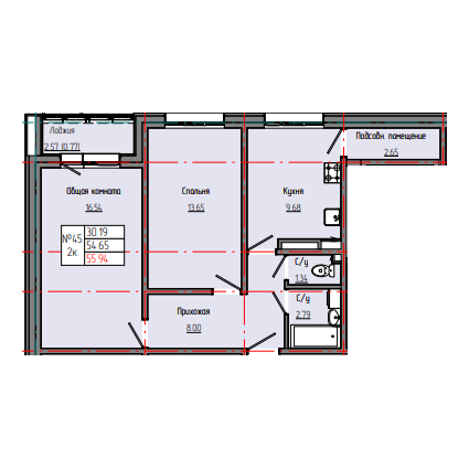 2-комн. 53,36 м² ・ № 45 ・ этаж 3/4 ・ ЗВЕЗДНЫЙ С3Б