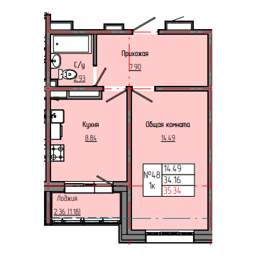 1-комн. 35,32 м² ・ № 48 ・ этаж 4/4 ・ ЗВЕЗДНЫЙ С3Б