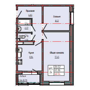 2-комн. 46,61 м² ・ № 5 ・ этаж 2/4 ・ ЗВЕЗДНЫЙ С3Б