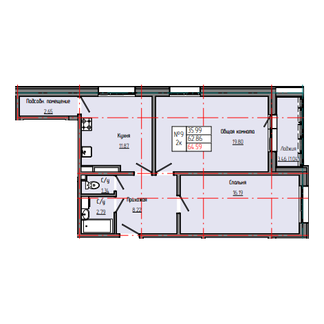 2-комн. 62,04 м² ・ № 9 ・ этаж 3/4 ・ ЗВЕЗДНЫЙ С3Б