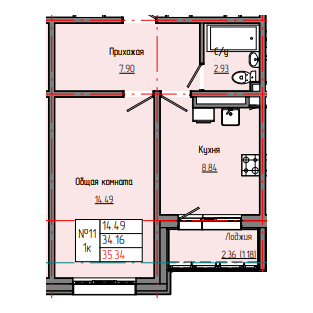 1-комн. 35,32 м² ・ № 11 ・ этаж 3/8 ・ ЗВЕЗДНЫЙ С3В