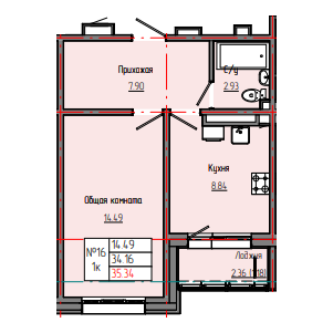1-комн. 35,32 м² ・ № 16 ・ этаж 4/8 ・ ЗВЕЗДНЫЙ С3В
