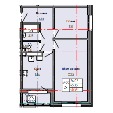 2-комн. 46,61 м² ・ № 25 ・ этаж 6/8 ・ ЗВЕЗДНЫЙ С3В