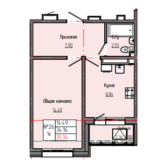 1-комн. 35,32 м² ・ № 26 ・ этаж 6/8 ・ ЗВЕЗДНЫЙ С3В