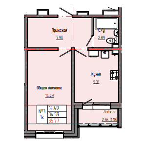 1-комн. 35,90 м² ・ № 3 ・ этаж 1/8 ・ ЗВЕЗДНЫЙ С3В