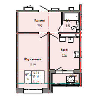 1-комн. 35,32 м² ・ № 31 ・ этаж 7/8 ・ ЗВЕЗДНЫЙ С3В