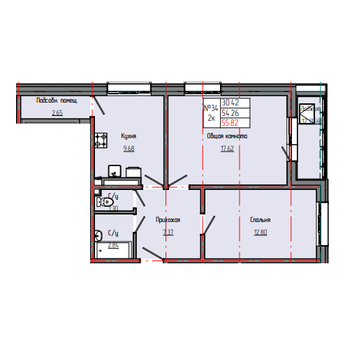 2-комн. 53,23 м² ・ № 34 ・ этаж 8/8 ・ ЗВЕЗДНЫЙ С3В