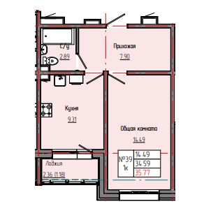 1-комн. 35,90 м² ・ № 39 ・ этаж 1/8 ・ ЗВЕЗДНЫЙ С3В