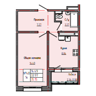 1-комн. 35,32 м² ・ № 48 ・ этаж 3/8 ・ ЗВЕЗДНЫЙ С3В