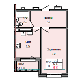1-комн. 35,32 м² ・ № 49 ・ этаж 3/8 ・ ЗВЕЗДНЫЙ С3В
