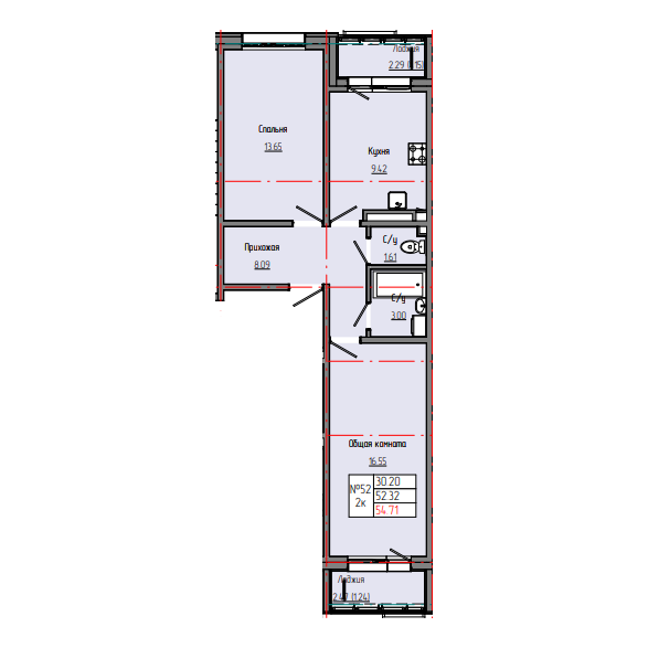 2-комн. 54,78 м² ・ № 52 ・ этаж 4/8 ・ ЗВЕЗДНЫЙ С3В