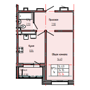 1-комн. 35,32 м² ・ № 54 ・ этаж 4/8 ・ ЗВЕЗДНЫЙ С3В