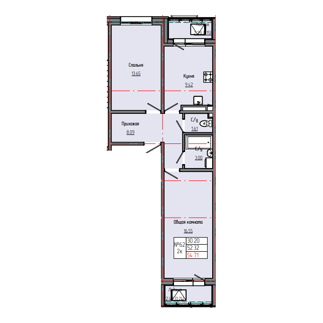 2-комн. 54,78 м² ・ № 62 ・ этаж 6/8 ・ ЗВЕЗДНЫЙ С3В