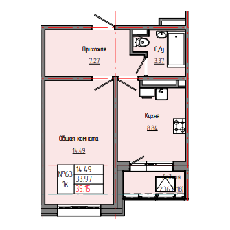 1-комн. 35,32 м² ・ № 63 ・ этаж 6/8 ・ ЗВЕЗДНЫЙ С3В