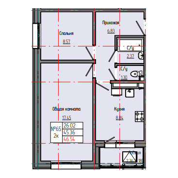 2-комн. 46,61 м² ・ № 65 ・ этаж 6/8 ・ ЗВЕЗДНЫЙ С3В