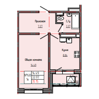 1-комн. 35,32 м² ・ № 68 ・ этаж 7/8 ・ ЗВЕЗДНЫЙ С3В