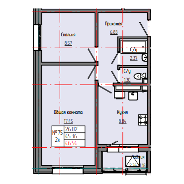 2-комн. 46,61 м² ・ № 75 ・ этаж 8/8 ・ ЗВЕЗДНЫЙ С3В