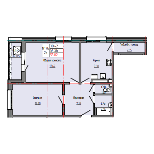 2-комн. 53,23 м² ・ № 76 ・ этаж 8/8 ・ ЗВЕЗДНЫЙ С3В