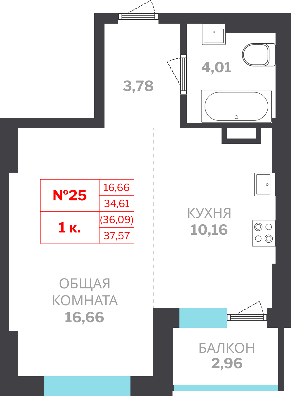 1-комн. 36,09 м² ・ № 25 ・ этаж 5/15 ・ МЖД по ул. Лонгинова, 1 очередь