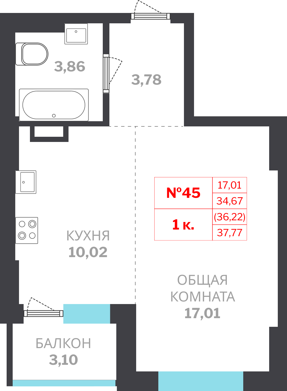1-комн. 36,22 м² ・ № 45 ・ этаж 8/15 ・ МЖД по ул. Лонгинова, 1 очередь