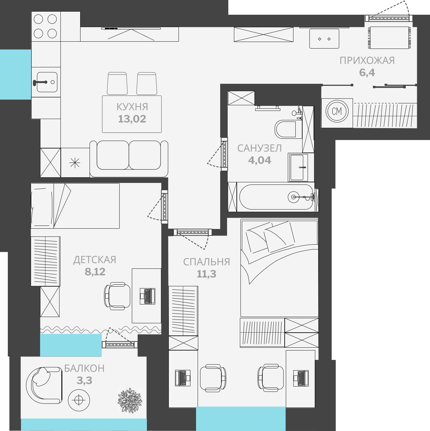 1-комн. 45,91 м² ・ № 75 ・ этаж 12/15 ・ МЖД по ул. Лонгинова, 1 очередь