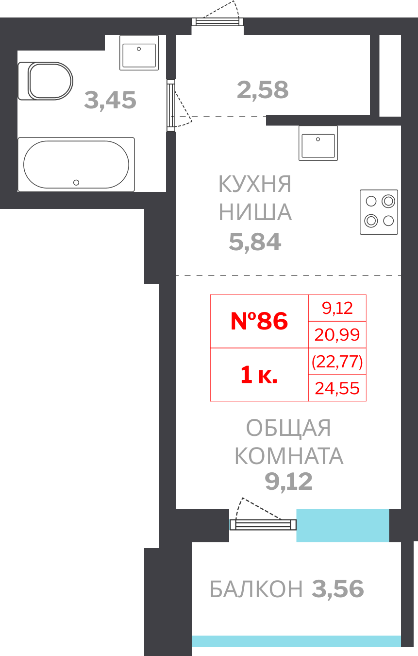 1-комн. 22,77 м² ・ № 86 ・ этаж 14/15 ・ МЖД по ул. Лонгинова, 1 очередь