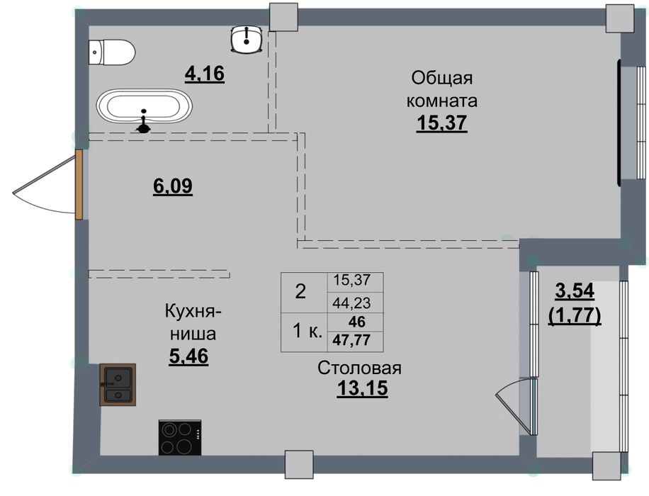 1-комн. 46,00 м² ・ № 32 ・ этаж 6/12 ・ ЖК УТУМ+ по ул. Верхоянская