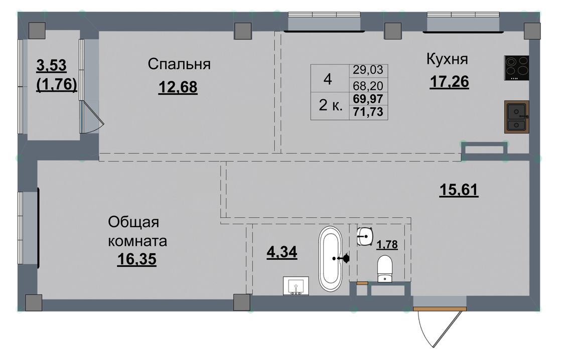2-комн. 69,97 м² ・ № 4 ・ этаж 2/12 ・ ЖК УТУМ+ по ул. Верхоянская