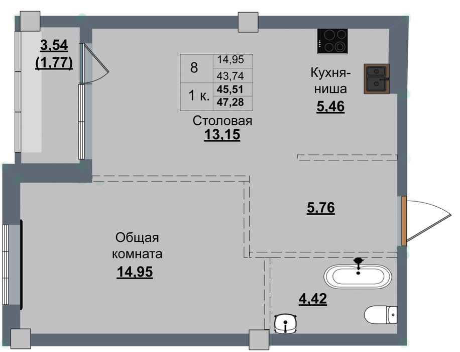 1-комн. 45,51 м² ・ № 88 ・ этаж 11/12 ・ ЖК УТУМ+ по ул. Верхоянская