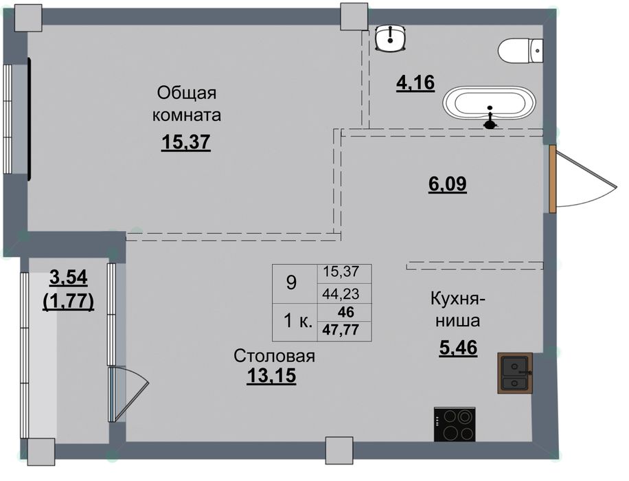 1-комн. 46,00 м² ・ № 89 ・ этаж 11/12 ・ ЖК УТУМ+ по ул. Верхоянская