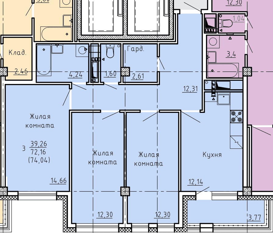3-комн. 74,05 м² ・ № 100 ・ этаж 15/16 ・ ЖК по ул. Лермонтова, д. 30