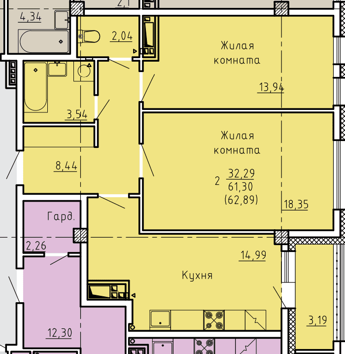 2-комн. 62,89 м² ・ № 105 ・ этаж 16/16 ・ ЖК по ул. Лермонтова, д. 30