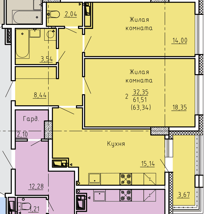 2-комн. 63,34 м² ・ № 49 ・ этаж 8/16 ・ ЖК по ул. Лермонтова, д. 30