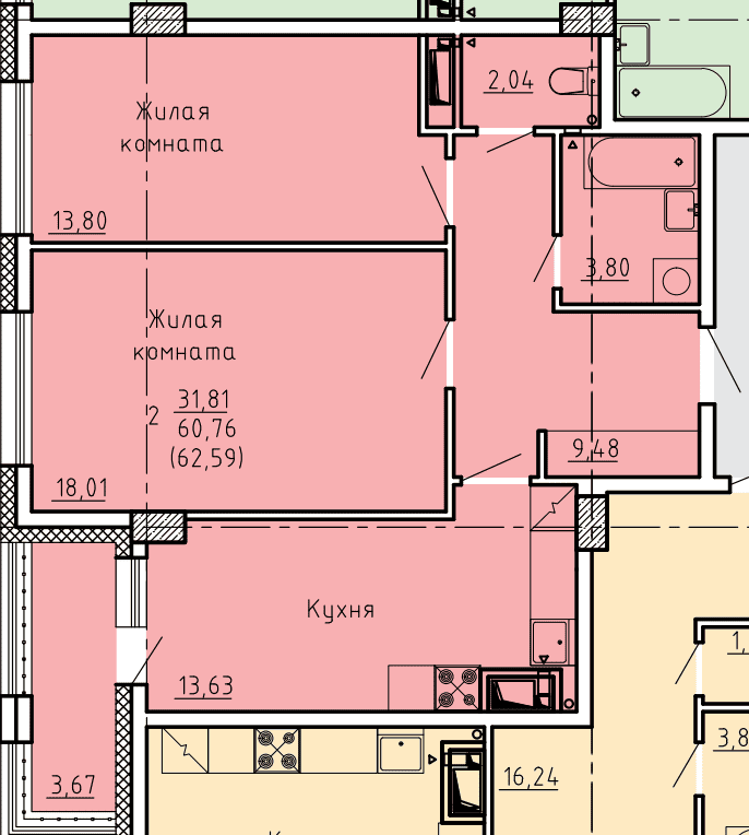 2-комн. 62,59 м² ・ № 60 ・ этаж 9/16 ・ ЖК по ул. Лермонтова, д. 30