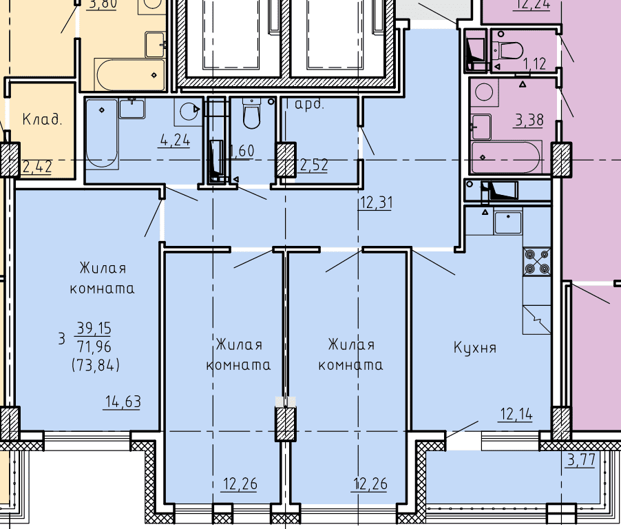 3-комн. 73,84 м² ・ № 65 ・ этаж 10/16 ・ ЖК по ул. Лермонтова, д. 30