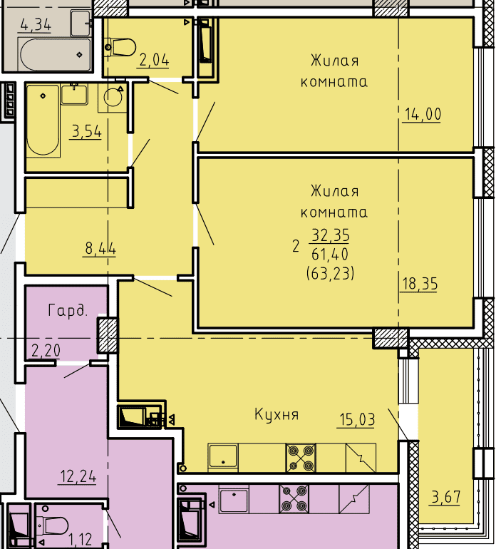 2-комн. 63,23 м² ・ № 77 ・ этаж 12/16 ・ ЖК по ул. Лермонтова, д. 30
