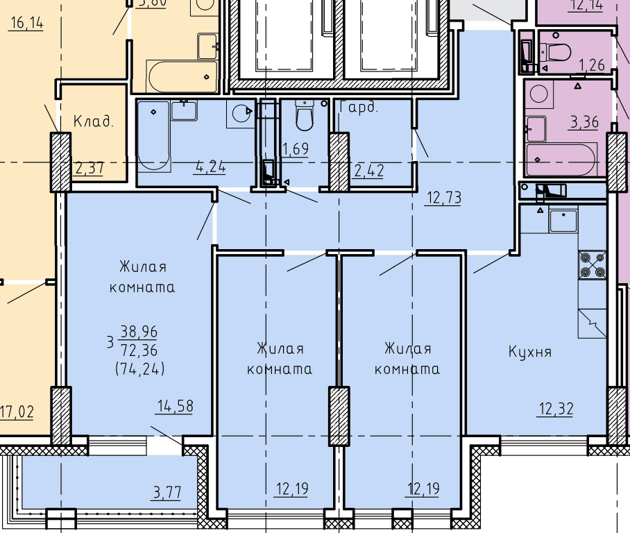 3-комн. 74,25 м² ・ № 9 ・ этаж 2/16 ・ ЖК по ул. Лермонтова, д. 30