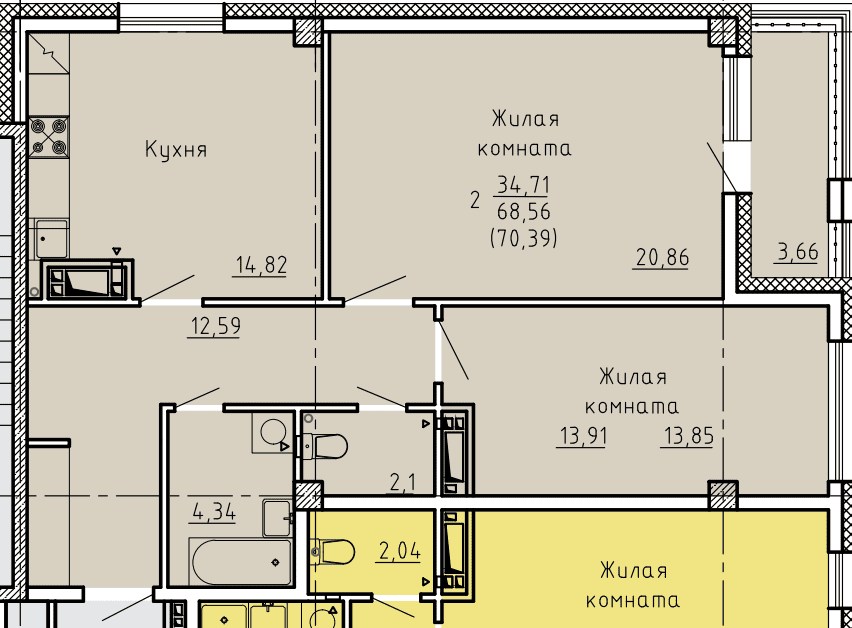 2-комн. 70,39 м² ・ № 90 ・ этаж 14/16 ・ ЖК по ул. Лермонтова, д. 30