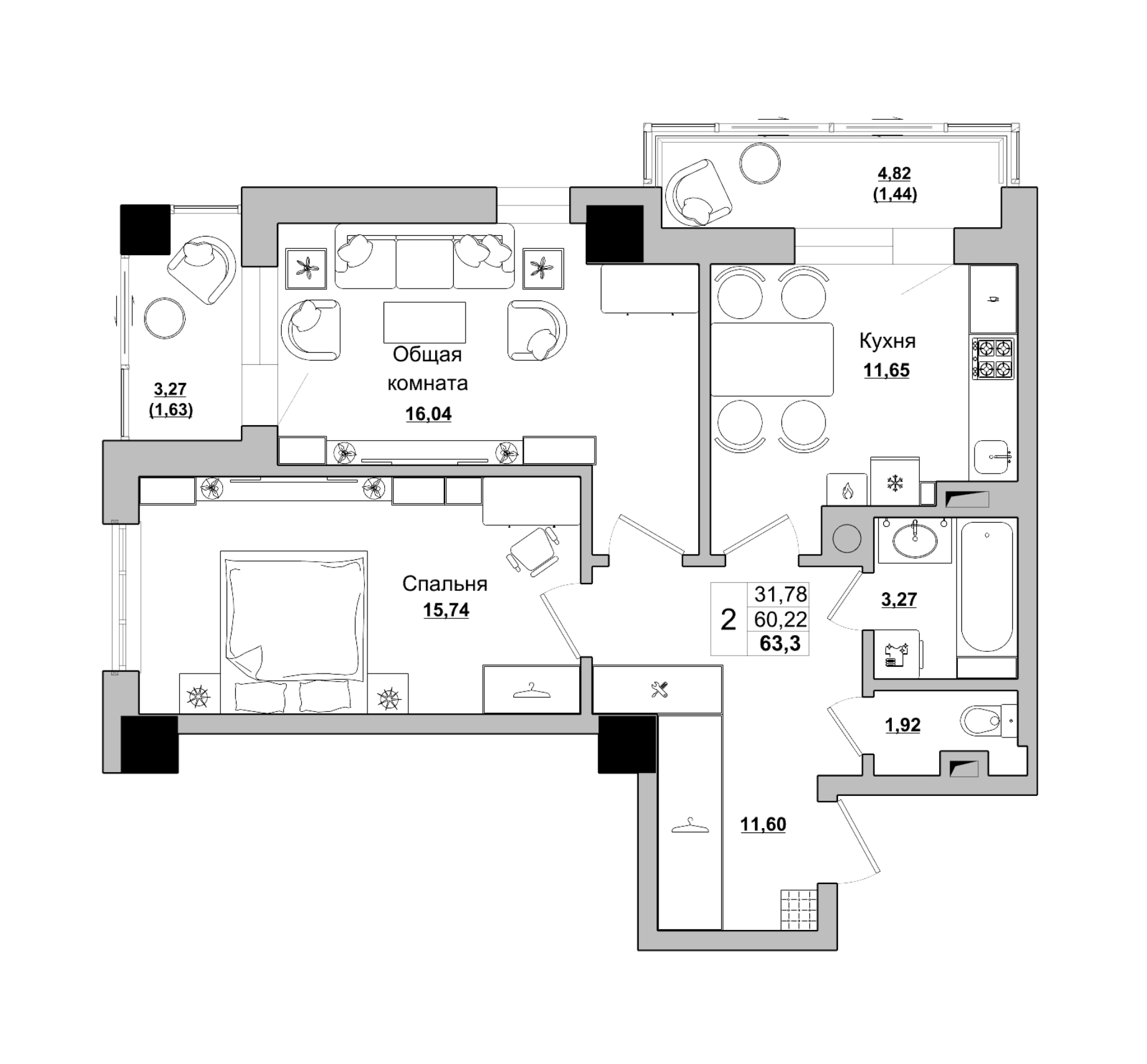 2-комн. 63,71 м² эт. 6/16
